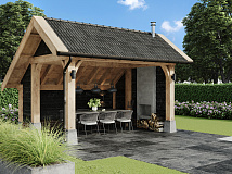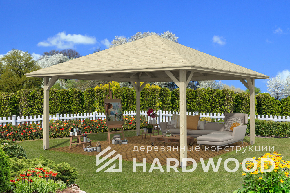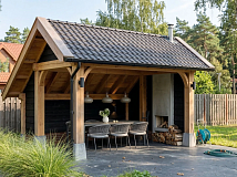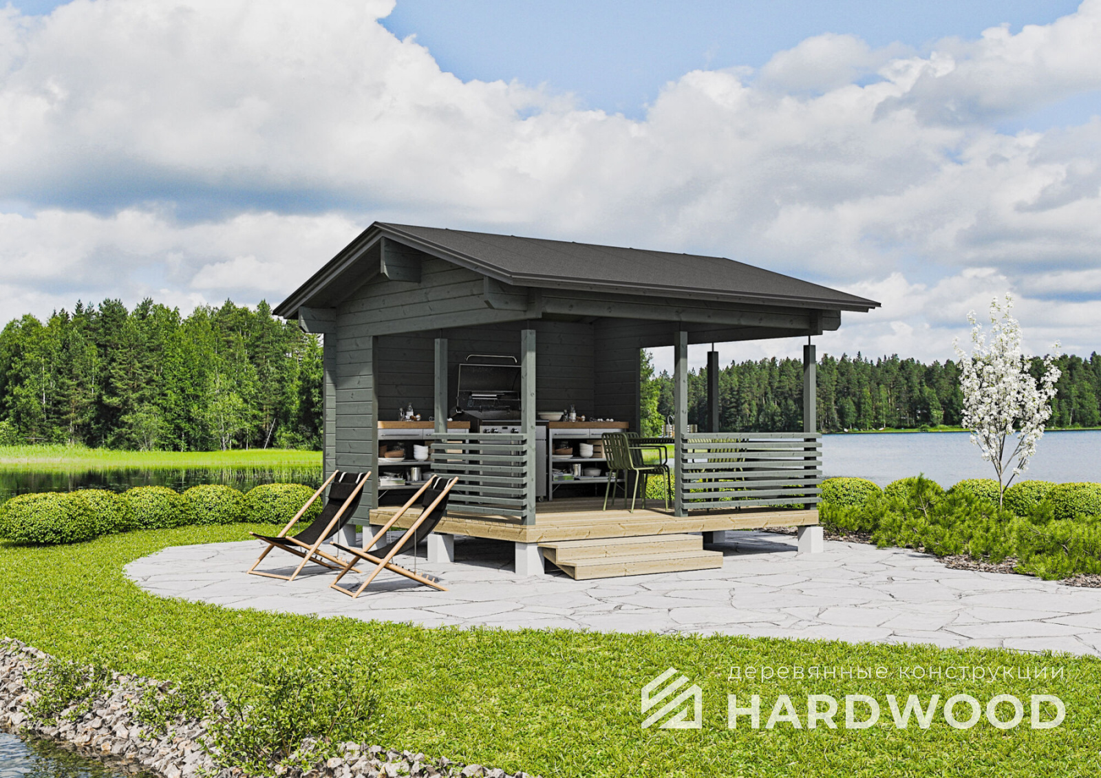 Двухскатный навес из массива премиального дерева — идеальное убежище для гурманов, ценящих открытый формат приготовления пищи. Выполненный в современном скандинавском стиле, этот садовый павильон сочетает в себе теплоту натурального дерева и брутальность бетонных элементов. Продуманная архитектура кровли обеспечивает надежную защиту от осадков, а открытый характер конструкции создает неповторимое ощущение единения с природой. Массивные деревянные балки и стропильная система не только выполняют свою функциональную роль, но и становятся ключевым декоративным элементом, придающим всей конструкции особый шарм и основательность — настоящий must-have для загородной жизни в стиле slow living.