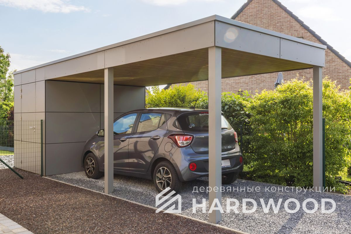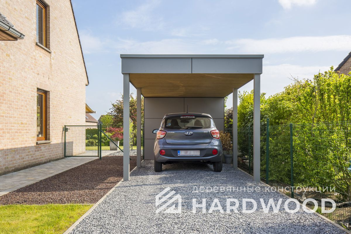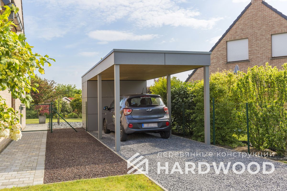 Ультрасовременный навес с хозблоком в стиле минимализм — воплощение эстетики хай-тек для ценителей лаконичных форм. Конструкция в благородном черном цвете создает эффектный контраст с теплыми деревянными ламелями, подчеркивая архитектурную выразительность и премиальный характер сооружения. Плоская кровля с идеально ровными линиями придает павильону особую геометрическую четкость, а просторная планировка позволяет комфортно разместить два автомобиля. Функциональный хозблок, интегрированный в конструкцию, обеспечивает дополнительное пространство для хранения, а перфорированные деревянные панели создают игру света и тени, добавляя визуальной легкости всему сооружению. Комбинация черного металлического каркаса и натурального дерева делает этот автомобильный шелтер стильным акцентом на территории современного загородного дома.